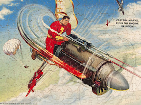 O Capitão Marvel era a sensação do momento nos anos 40 e ele foi licenciado para os mais diversos produtos. Alguns desses produtos a própria Fawcett produziu. Um desses produtos é o quebra-cabeça do Capitão Marvel de 1941. O brinquedo é intitulado "Captain Marvel Picture Puzzle" e o quebra-cabeça "Captain Marvel Rides The Engine Of Doom". Fotos de Internet.